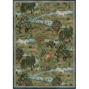This is a 1:12 or 1" scale dollhouse miniature area rug in green with animals and trees. It measures approximately 5" x 7". Because colors don't always appear the same on every monitor, the actual dollhouse rug may be a slightly different color than what you see on your screen. The dollhouse rug is printed on velvet paper giving it the look and feel of a real rug. Velvet paper is heavier than regular paper resulting in a rug that lies flatter than rugs printed on thinner paper products. It is about the thickness of card stock but not stiff. It has velvet flocking on one side and plain paper on the back side.