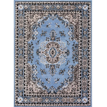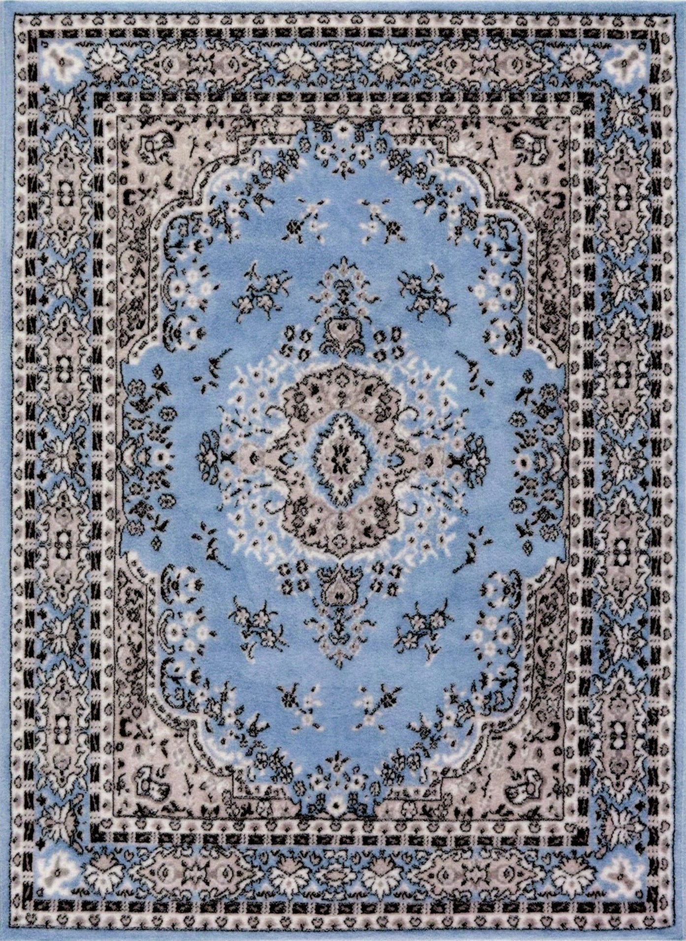 This is a 1:12 or 1" scale oriental dollhouse miniature area rug in blue, ivory and grey. It measures approximately 6-15/16" x 9-1/2". Because colors don't always appear the same on every monitor, the actual dollhouse rug may be a slightly different color than what you see on your screen. The dollhouse rug is printed on velvet paper giving it the look and feel of a real rug. Velvet paper is heavier than regular paper resulting in a rug that lies flatter than rugs printed on thinner paper products. It is about the thickness of card stock but not stiff. It has velvet flocking on one side and plain paper on the back side.