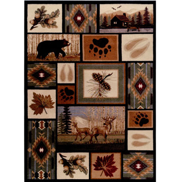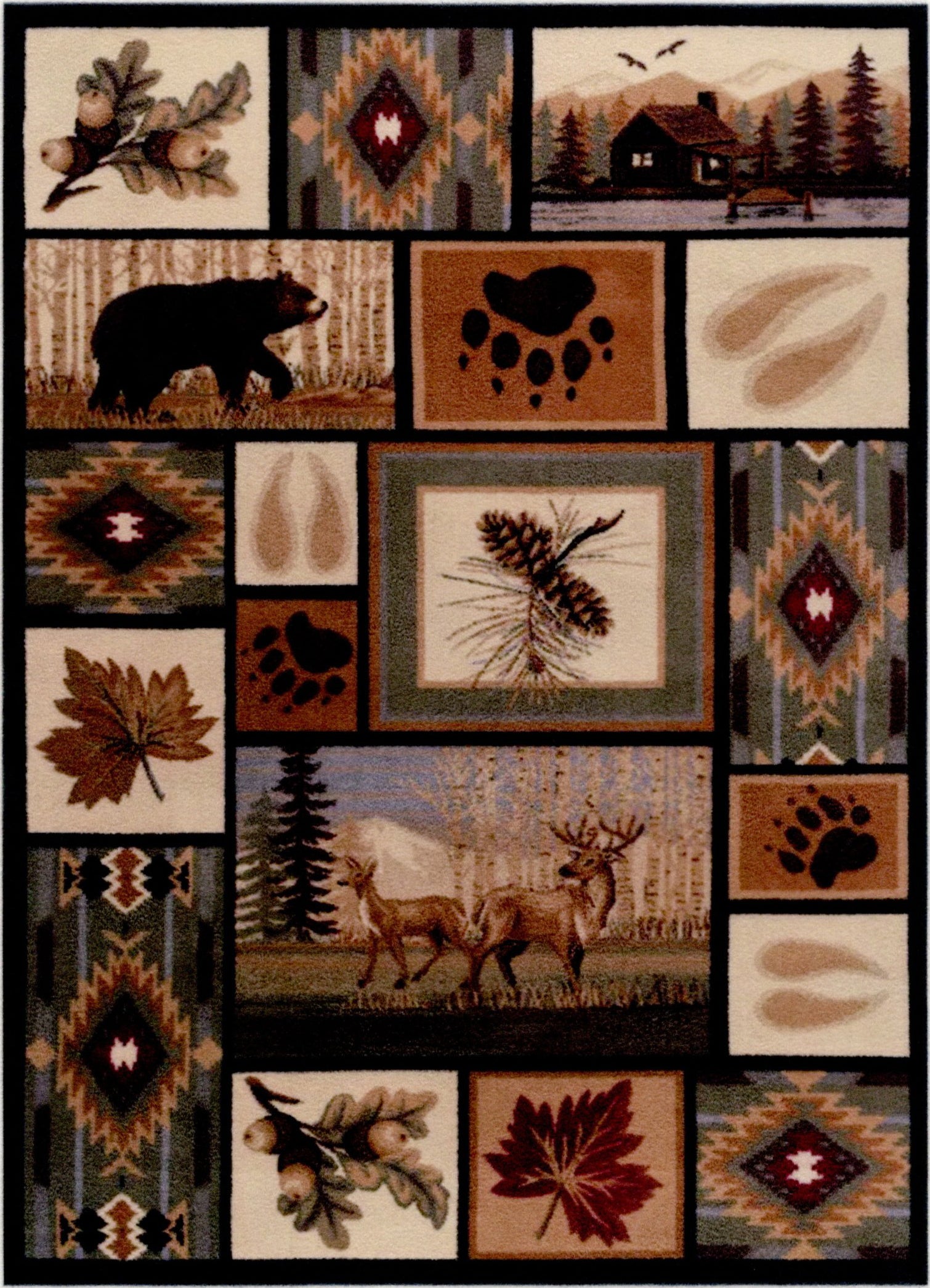 This is a 1:12 or 1" scale rustic dollhouse miniature area rug with deer, bear, pinecones, acorns leaves and a southwestern motif. It measures approximately 7-1/2" x 10-3/8". Because colors don't always appear the same on every monitor, the actual dollhouse rug may be a slightly different color than what you see on your screen. The dollhouse rug is printed on velvet paper giving it the look and feel of a real rug. Velvet paper is heavier than regular paper resulting in a rug that lies flatter than rugs printed on thinner paper products. It is about the thickness of card stock but not stiff. It has velvet flocking on one side and plain paper on the back side.