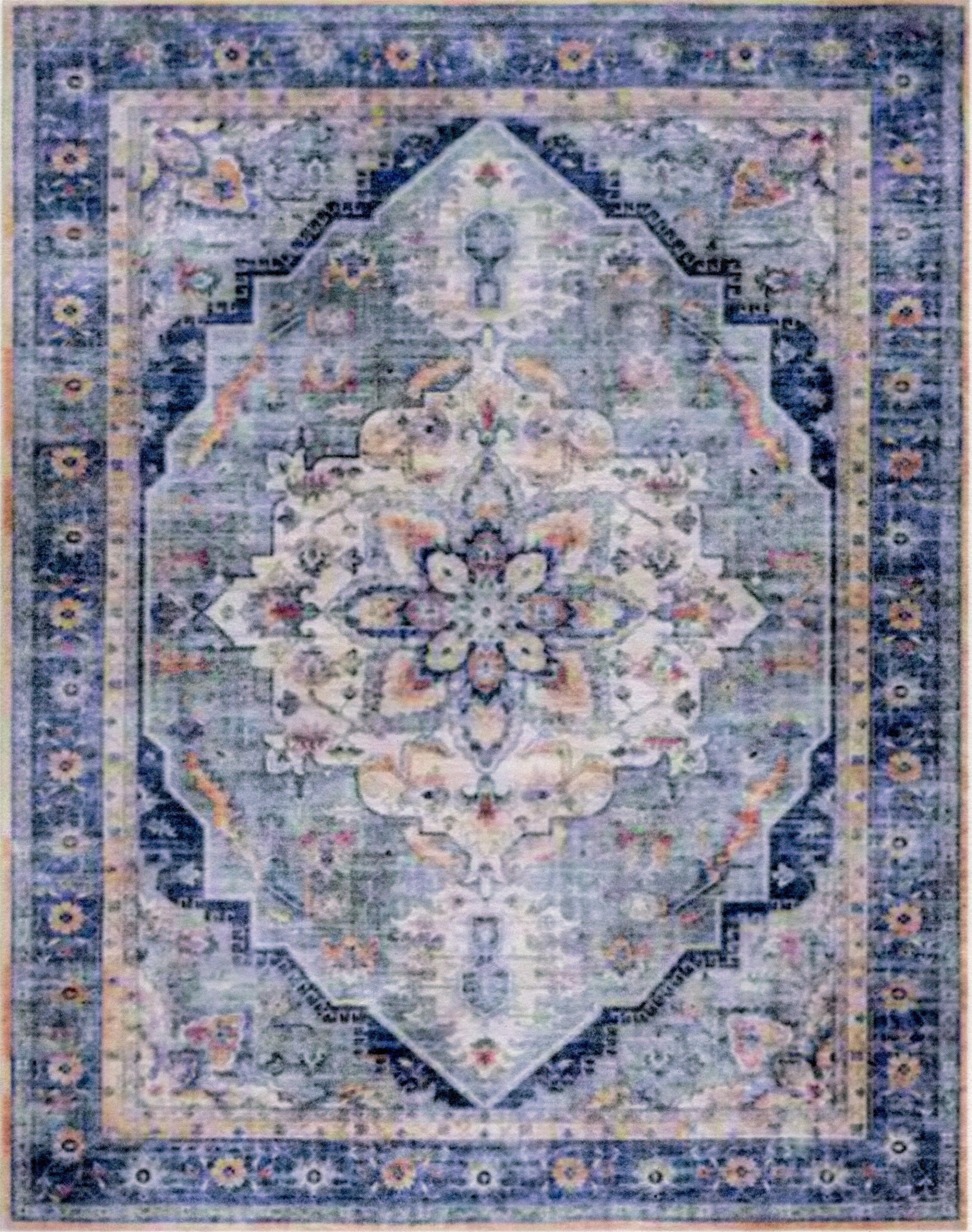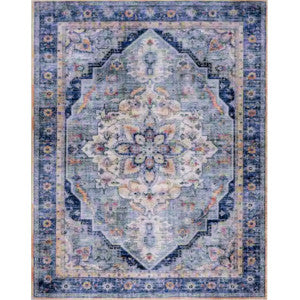 This is a 1:12 or 1" scale dollhouse miniature faded blue oriental area rug. It measures approximately 7-1/2" x 9-1/2". Because colors don't always appear the same on every monitor, the actual dollhouse rug may be a slightly different color than what you see on your screen. The dollhouse rug is printed on velvet paper giving it the look and feel of a real rug. Velvet paper is heavier than regular paper resulting in a rug that lies flatter than rugs printed on thinner paper products. It is about the thickness of card stock but not stiff. It has velvet flocking on one side and plain paper on the back side.