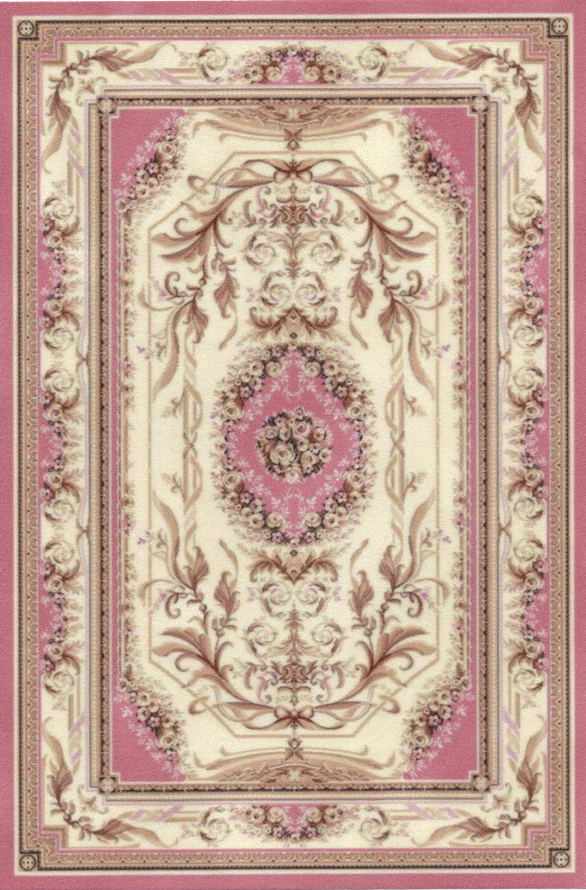 This is a 1:12 or 1" scale dollhouse miniature area rug in pink, ivory, beige and brown. It measures approximately 7" x 10-1/2". Because colors don't always appear the same on every monitor, the actual dollhouse rug may be a slightly different color than what you see on your screen. The dollhouse rug is printed on velvet paper giving it the look and feel of a real rug. Velvet paper is heavier than regular paper resulting in a rug that lies flatter than rugs printed on thinner paper products. It is about the thickness of card stock but not stiff. It has velvet flocking on one side and plain paper on the back side.