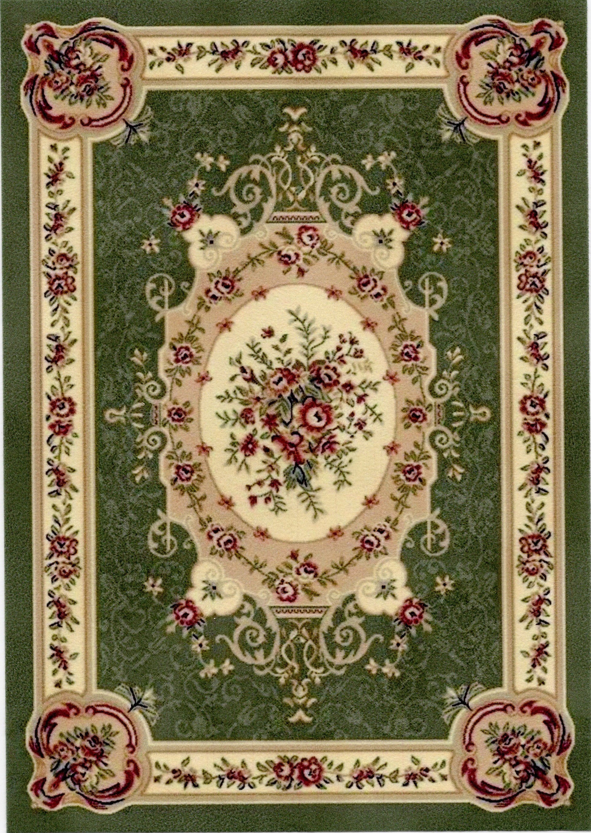 This is a 1:12 or 1" scale dollhouse miniature area rug in green, ivory, tan and burgundy. It measures approximately 7" x 9-15/16". Because colors don't always appear the same on every monitor, the actual dollhouse rug may be a slightly different color than what you see on your screen. The dollhouse rug is printed on velvet paper giving it the look and feel of a real rug. Velvet paper is heavier than regular paper resulting in a rug that lies flatter than rugs printed on thinner paper products. It is about the thickness of card stock but not stiff. It has velvet flocking on one side and plain paper on the back side.