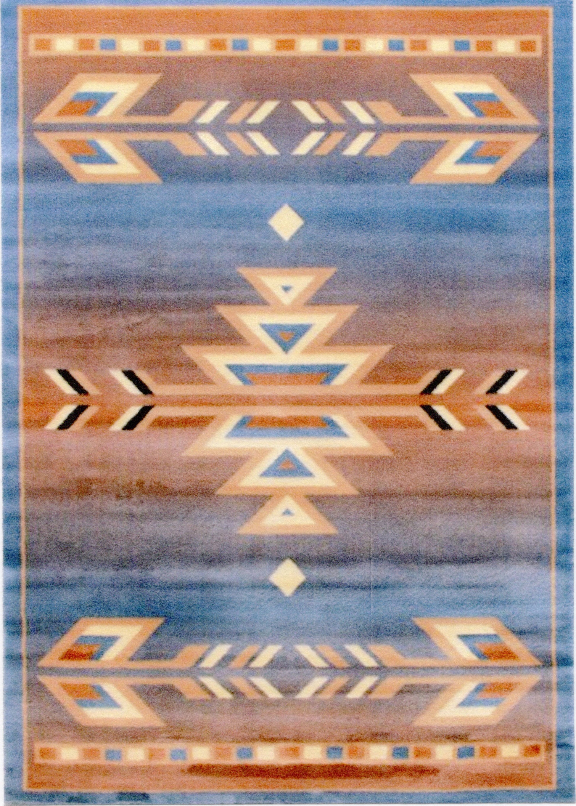 This is a 1:12 or 1" scale dollhouse miniature southwestern style area rug in blue, tan, ivory and black. It measures approximately 6-7/8" x 9". Because colors don't always appear the same on every monitor, the actual dollhouse rug may be a slightly different color than what you see on your screen. The dollhouse rug is printed on velvet paper giving it the look and feel of a real rug. Velvet paper is heavier than regular paper resulting in a rug that lies flatter than rugs printed on thinner paper products. It is about the thickness of card stock but not stiff. It has velvet flocking on one side and plain paper on the back side.