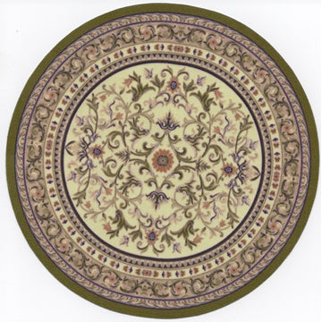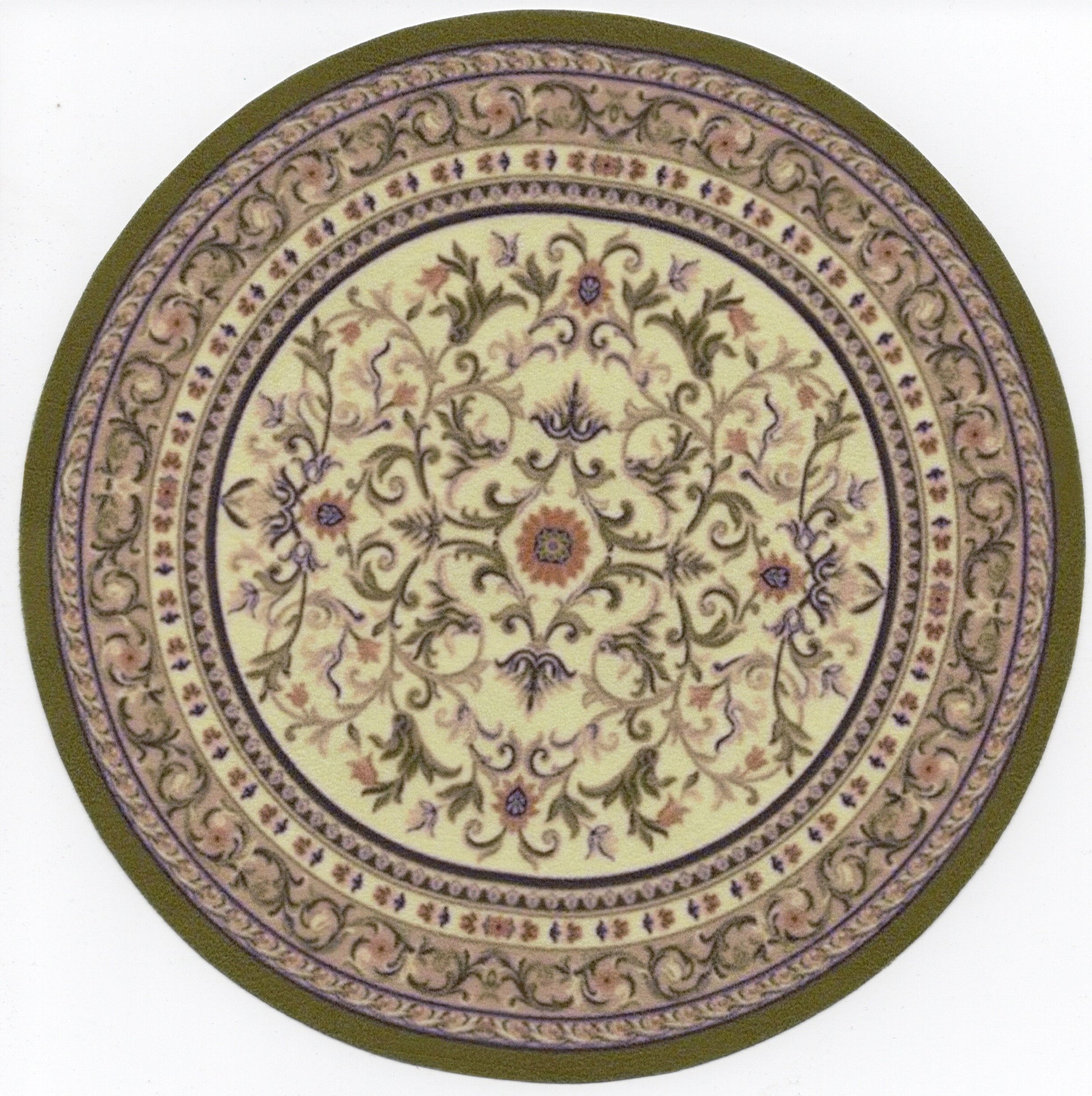 This is a really beautiful 1:12 or 1" scale round dollhouse miniature area rug in green, ivory, tan and purple. It measures approximately 8". Because colors don't always appear the same on every monitor, the actual dollhouse rug may be a slightly different color than what you see on your screen. The dollhouse rug is printed on velvet paper giving it the look and feel of a real rug. Velvet paper is heavier than regular paper resulting in a rug that lies flatter than rugs printed on thinner paper products. It is about the thickness of card stock but not stiff. It has velvet flocking on one side and plain paper on the back side.