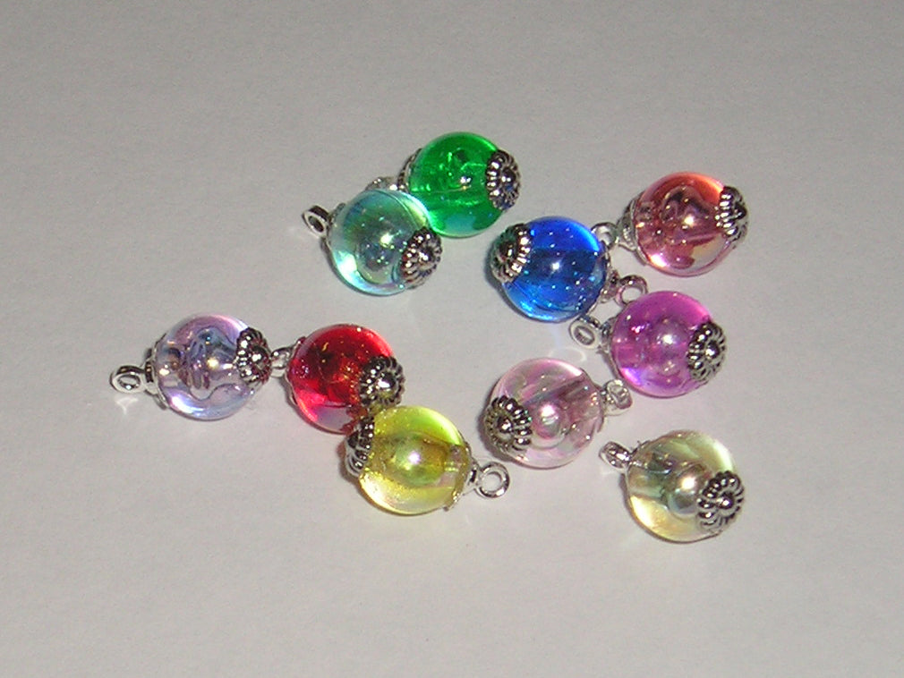 These are 1:12 or 1" Scale dollhouse miniature 8mm Christmas ornaments in assorted colors. There are 10 pieces in the package. They are translucent plastic beads. All you need are the hangers.