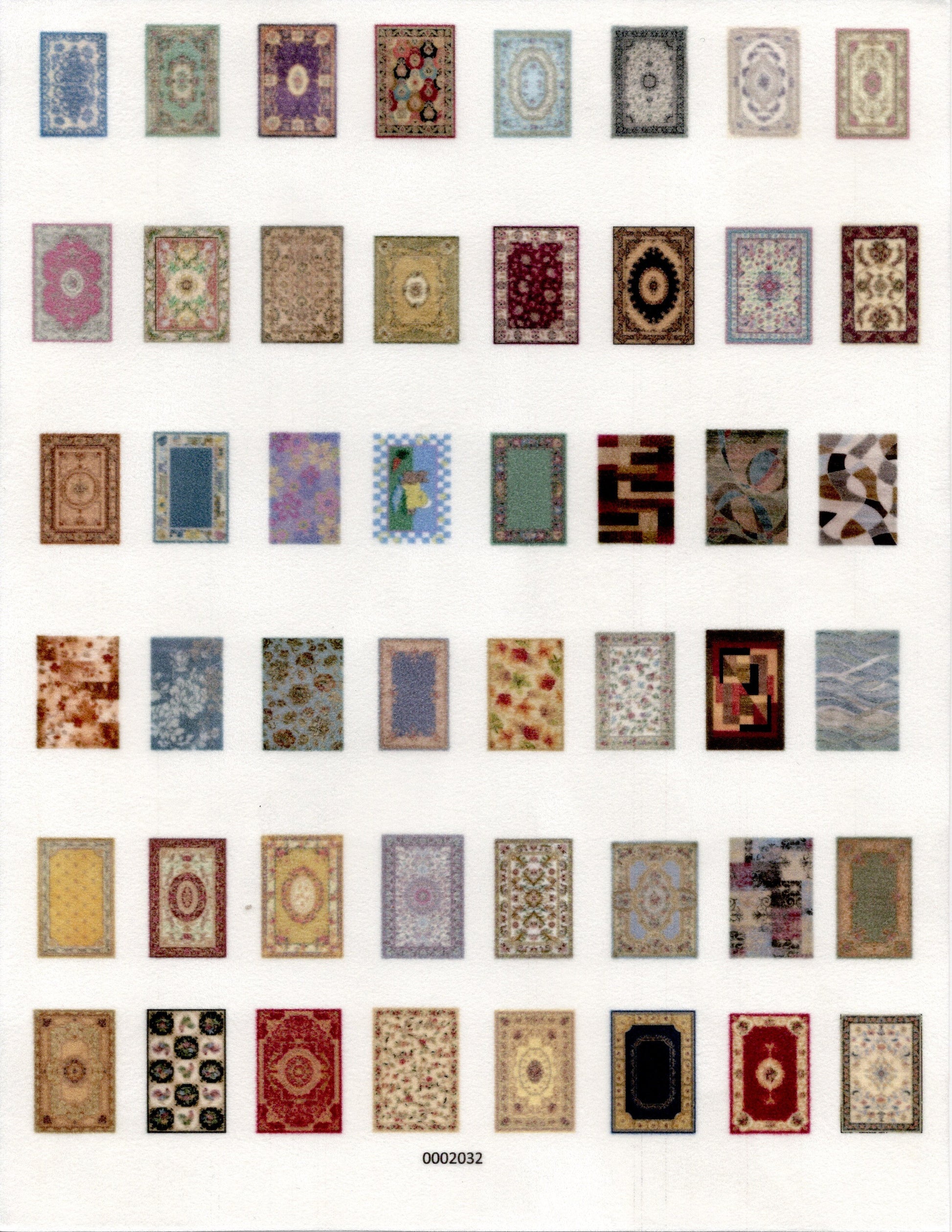 This is a full 8.5" x 11" inch sheet of 1:144 scale dollhouse miniature area rugs for a total of 48 rugs printed on velvet paper. All you need to do is cut them out. There are a total of 48 rugs. Because colors don't always appear the same on every monitor, the actual dollhouse rug may be a slightly different color than what you see on your screen. The dollhouse rug is printed on velvet paper giving it the look and feel of a real rug. Velvet paper is heavier than regular paper resulting in a rug that lies flatter than rugs printed on thinner paper products. It is about the thickness of card stock but not stiff. It has velvet flocking on one side and plain paper on the back side.