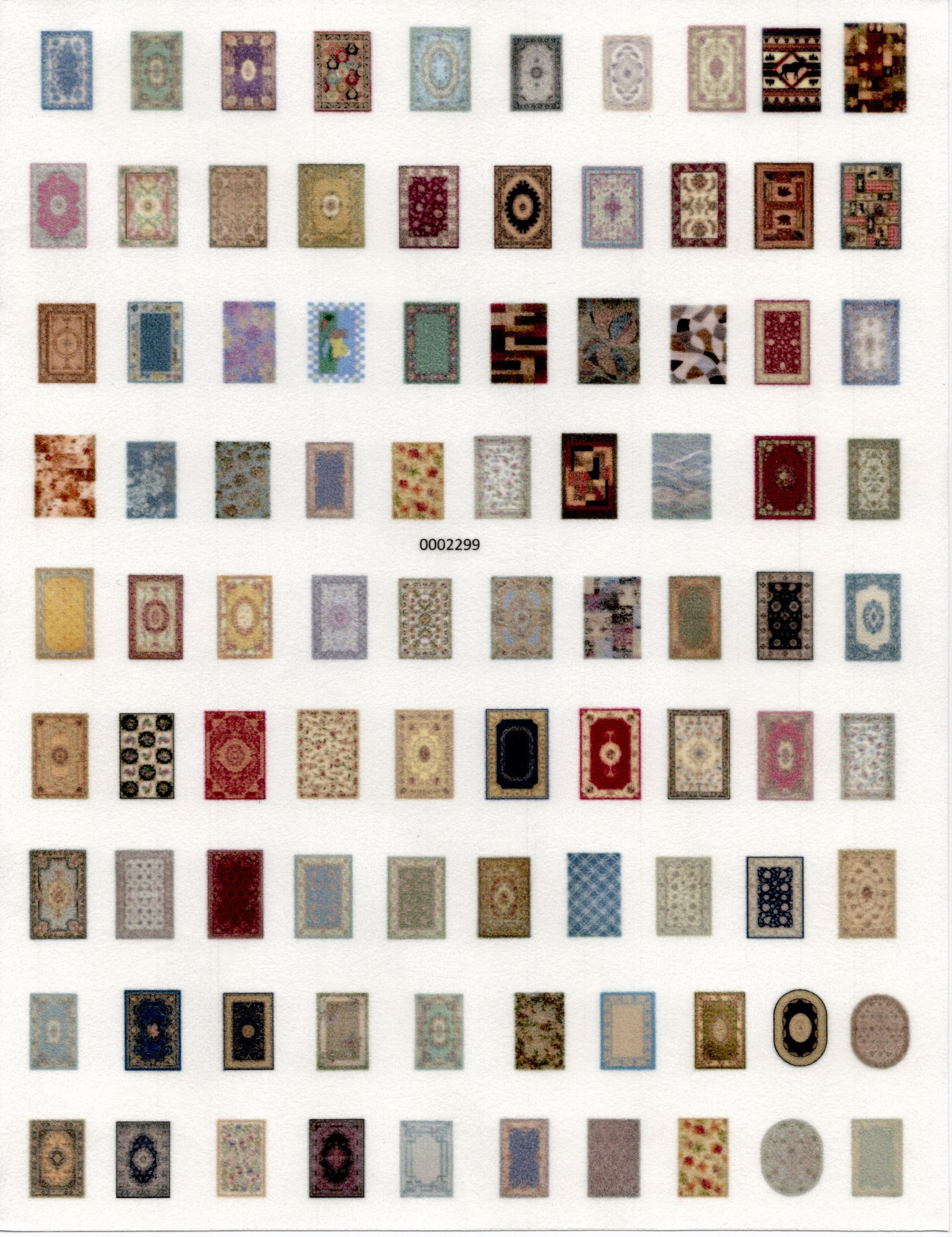 This is a full 8.5 x 11 inch sheet of 1:144 scale dollhouse miniature area rugs for a total of 90 very tiny rugs printed on velvet paper. All you need to do is cut them out. There are a total of 90 rugs. They measure around 1/2" x 3/4". They vary in size very slightly. Because colors don't always appear the same on every monitor, the actual rug may be a slightly different color than what you see on your screen. These rugs are printed on velvet paper giving it the look and feel of a real rug. The paper is approximately the thickness of card stock without the stiffness. The velvet flocking is on one the front and the back is plain paper.