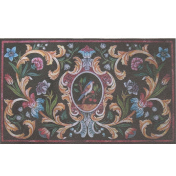 This is a 1:24 or 1/2" scale dollhouse miniature area rug with a black background a bird in the center, blue, pink and lavender flowers. It measures approximately 3-7/16" x 5-3/4". Because colors don't always appear the same on every monitor, the actual dollhouse rug may be a slightly different color than what you see on your screen. The dollhouse rug is printed on velvet paper giving it the look and feel of a real rug. Velvet paper is heavier than regular paper resulting in a rug that lies flatter than rugs printed on thinner paper products. It is about the thickness of card stock but not stiff. It has velvet flocking on one side and plain paper on the back side.