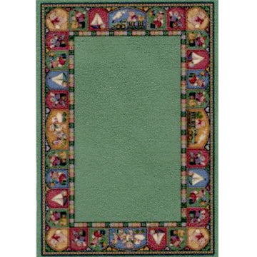 This is a 1:24 or 1/2" scale dollhouse miniature area rug for a child's room or a nursery. It has a green background with toys in the border. It measures approximately 3-9/16" x 5-1/8". Because colors don't always appear the same on every monitor, the actual dollhouse rug may be a slightly different color than what you see on your screen. The dollhouse rug is printed on velvet paper giving it the look and feel of a real rug. Velvet paper is heavier than regular paper resulting in a rug that lies flatter than rugs printed on thinner paper products. It is about the thickness of card stock but not stiff. It has velvet flocking on one side and plain paper on the back side.
