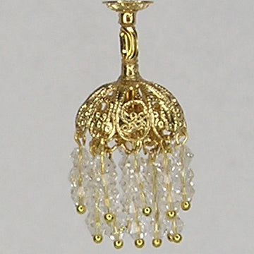This is a 1:24 or 1/2" Scale Dollhouse Miniature Round Crystal Bead Double Tier Chandelier (70 beads) with a 12V LED strip containing 4 LED's. It is handcrafted by Needles N Minis using Austrian crystals, rainbow bugle beads and gold-tone jewelry findings. It measures approximately 1-5/8" long from ceiling mount to bottom of bugle beads and 7/8" wide.