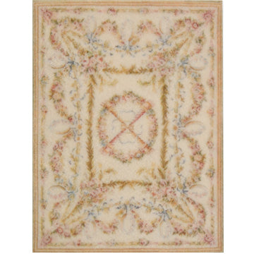 This is a 1:48, 1/4" scale dollhouse miniature area rug in pink, blue, gold on an ivory background. It measures approximately 2-1/4 x 3 inches. Because colors don't always appear the same on every monitor, the actual dollhouse rug may be a slightly different color than what you see on your screen. The dollhouse rug is printed on velvet paper giving it the look and feel of a real rug. Velvet paper is heavier than regular paper resulting in a rug that lies flatter than rugs printed on thinner paper products. It is about the thickness of card stock but not stiff. It has velvet flocking on one side and plain paper on the back side.