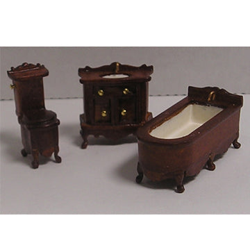 This is a 1:48 or 1/4" Scale dollhouse minature furniture Bathroom Set including the toilet, bathtub and sink. It is handcrafted by Miniland. It has a walnut finish. The detail is amazing for such a small scale. You won't be disappointed with the quality of this piece.