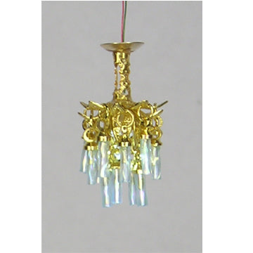 This is a 1:48, 1/4" Scale dollhouse miniature light 3V LED Crystal Chandelier with aqua spiral glass bugle beads and gold-tone metal jewelry findings. Handcrafted by Needles N Minis. It measures approximately 1" long from ceiling mount to bottom of bugle beads and 5/8" wide with 7" of very fine wire. It comes with a 3V LED light. Use with our 3V battery holder with an on/off switch, sold separately. Check out our Electrical Products for descriptions, options, prices and pictures.