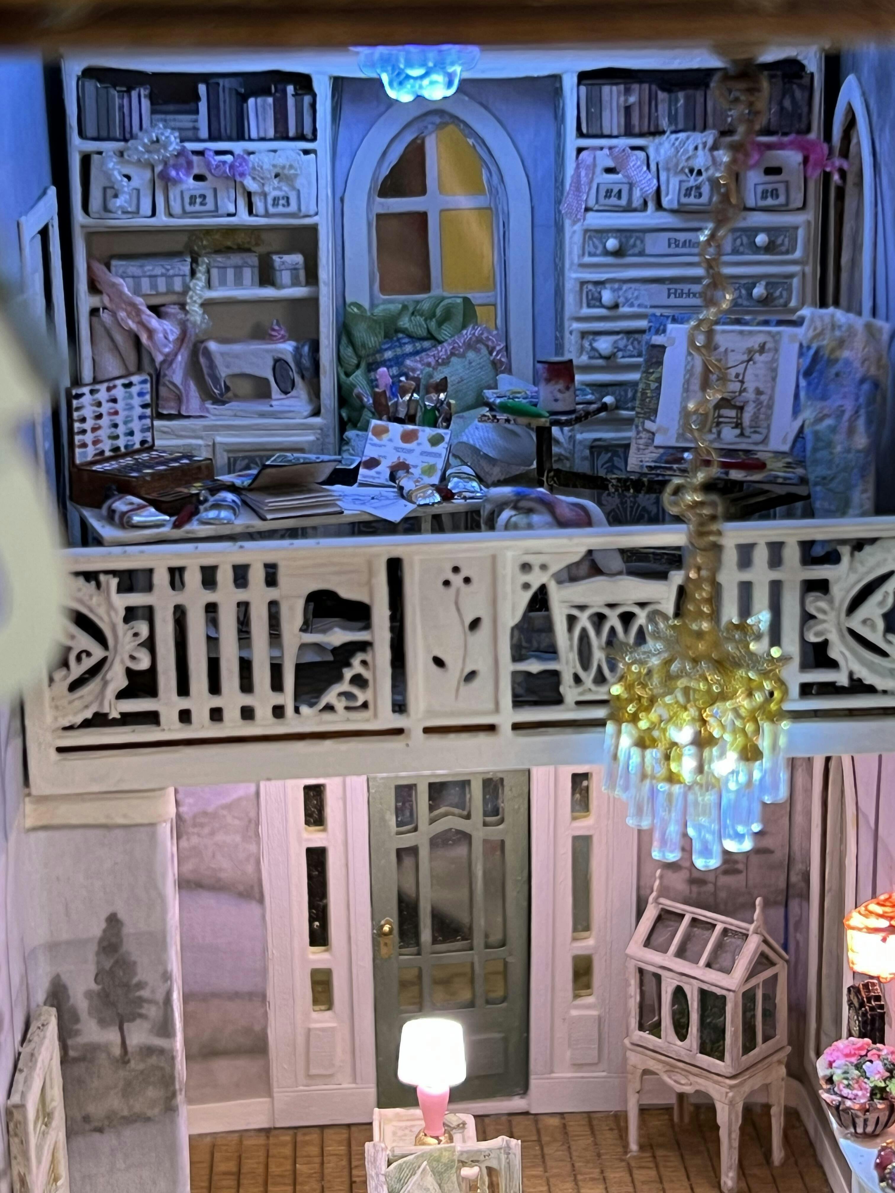 This is a 1:48, 1/4" Scale dollhouse miniature light 3V LED Crystal Chandelier with clear glass bugle beads and gold-tone metal jewelry findings. Handcrafted by Needles N Minis. It measures approximately 1" long from ceiling mount to bottom of bugle beads and 5/8" wide with 7" of very fine wire. It comes with a 3V, LED light. Use with our 3V battery holder with an on/off switch, sold separately. Check out our Electrical Products for descriptions, options, prices and pictures.