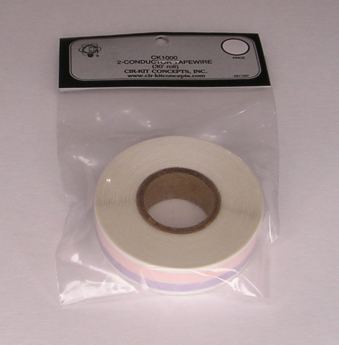 The double conductor tapewire is the "heart" of all Cir-Kit wiring systems. From its introduction in 1976 to the present it has been the predominant method of dollhouse wiring. Its use creates a printed circuit type layout and completely eliminates the congested wiring found in conventional systems. A super strong adhesive, exposed by the removal of a peel away paper carrier, ensures a secure grip on any surface. Since the copper foils are sandwiched between two layers of transparent tape, the tape may be applied even over bare metal. The exposed transparent tape has a matte finish allowing easy application and retention of paint.